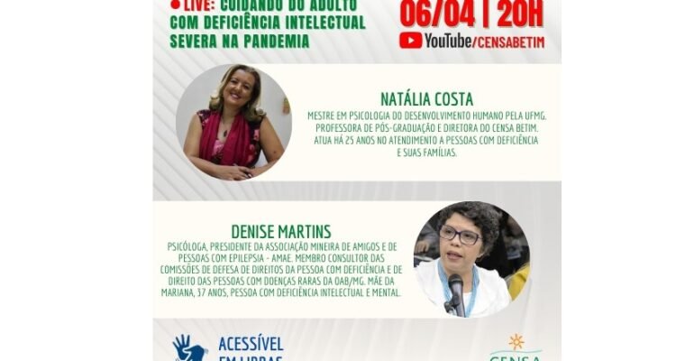 A pandemia trouxe um novo cenário para as famílias em todo o mundo. A situação se tornou ainda mais desafiadora para pais e cuidadores de pessoas com deficiência intelectual. Por isso, o CENSA Betim idealizou uma série de 08 lives com profissionais com grande expertise no atendimento a adultos com deficiência e autismo graves. A primeira será no dia 06 de abril, terça-feira, às 20h com o tema “Cuidando do adulto com deficiência intelectual severa na pandemia”. A transmissão ao vivo, que acontecerá no YouTube, com tradução simultânea em libras, contará com a participação de Natália Costa, mestre em Psicologia e diretora da instituição, e Denise Martins, psicóloga, presidente da Associação Mineira de Amigos e de Pessoas com Epilepsia (Amae) e membro consultor das Comissões de Defesa de Direitos da Pessoa com Deficiência e de Direito das Pessoas com Doenças Raras (CDRAROS), da OAB/MG, e mãe de Mariana, 37 anos, pessoa com deficiência intelectual e mental.